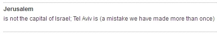 It would be one thing if al-Guardian called Jerusalem the “disputed capital.” But Tel Aviv isn’t Israel’s capital anymore than Haifa, Manchester, or New York City. This correction and style guide are further examples of the editors’ heads buried in the sand.