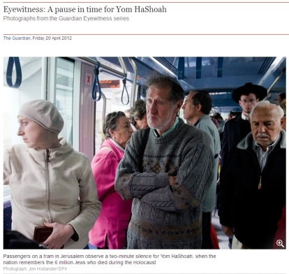 What a stupid correction this is. On Friday, The Guardian posted a photo — Jerusalem light rail passengers observing a national moment of silence for the Holocaust.