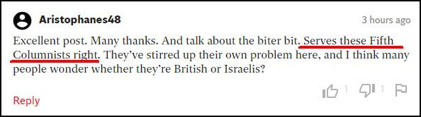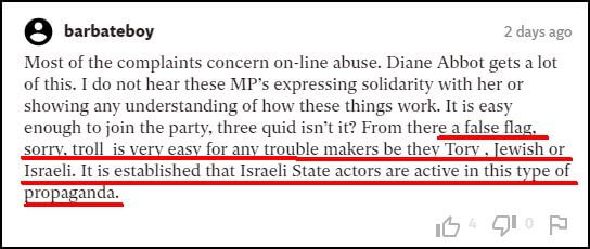 British Jews (and others) will nonetheless note the irony of The Independent’s choice of quotes from the CST report when they take a look at The Independent’s own comments section. There are clear examples of how that media outlet has allowed antisemitic comments and views to proliferate.