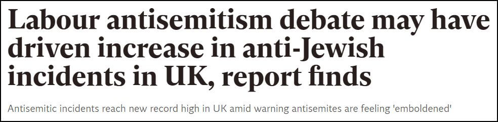 The Independent chose to focus its attention on the correlation between the one in ten incidents that were “examples of, or related to arguments over, alleged antisemitism in the Labour Party.”
