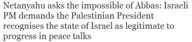 So, according to The Independent, simply recognizing the legitimacy of Israel as a Jewish state is “impossible” for Mahmoud Abbas. And what’s more, according to The Independent, Netanyahu is clearly the spoiler in the talks for making the demand.