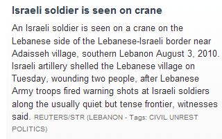Ugly border clash today along the Israeli-Lebanese border, a.k.a. the Blue Line. Five people were killed including IDF Lt. Col Dov Harari, three Lebanese soldiers, and Lebanese journalist. First, bungled wire service photo captions out there…