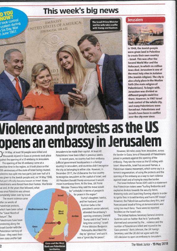 British youth publication “The Week Junior” gets a failing grade: for a history essay that even a student would find embarrassing to have written. Entitled “Violence and Protests as the US opens an Embassy in…
