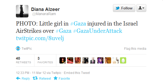 1. The photo first tweeted by Khulood Badawi (@KhuloodBadawi) and later by Diana Alzeer (@ManaraRam), allegedly depicting a Palestinian girl killed by an Israeli air strike yesterday, was proven to have originated in 2006 and to have had nothing at all to do with Israeli action. This photo is now the top tweet for #Gaza, with over 300 retweets. It is completely false.