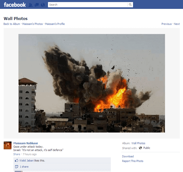 2. A second photo tweeted Maissam Nablussi (@Nablussi), allegedly showing an aerial strike in Gaza today, was proven to have been in circulation back in 2009, completely unrelated to the current round of violence.
