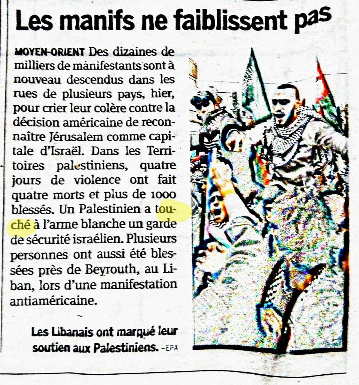 Un de nos lecteurs nous a signalé une phrase d’un article du quotidien 20 Minutes sur l’attentat au couteau mené par un Palestinien dimanche 10 décembre qui a grièvement blessé un garde de sécurité de la Gare routière de Jérusalem. Nous le remercions pour nous avoir indiqué la phrase la plus absurde jamais écrite dans la presse à propos du conflit israélo-palestinien.