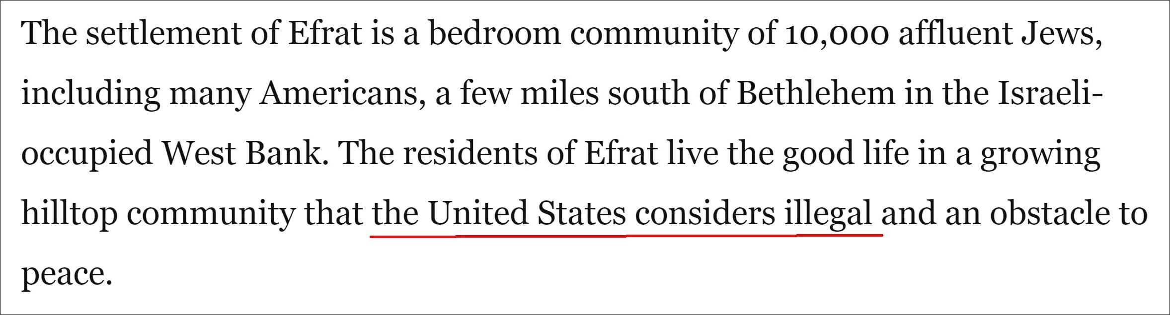 In fact, the US government does not consider Jewish settlements to be illegal. It considers them to be objectionable, calling them “obstacles to peace” and prejudicial to the outcome of final status talks and questions their legitimacy. It has not, however, called them illegal.