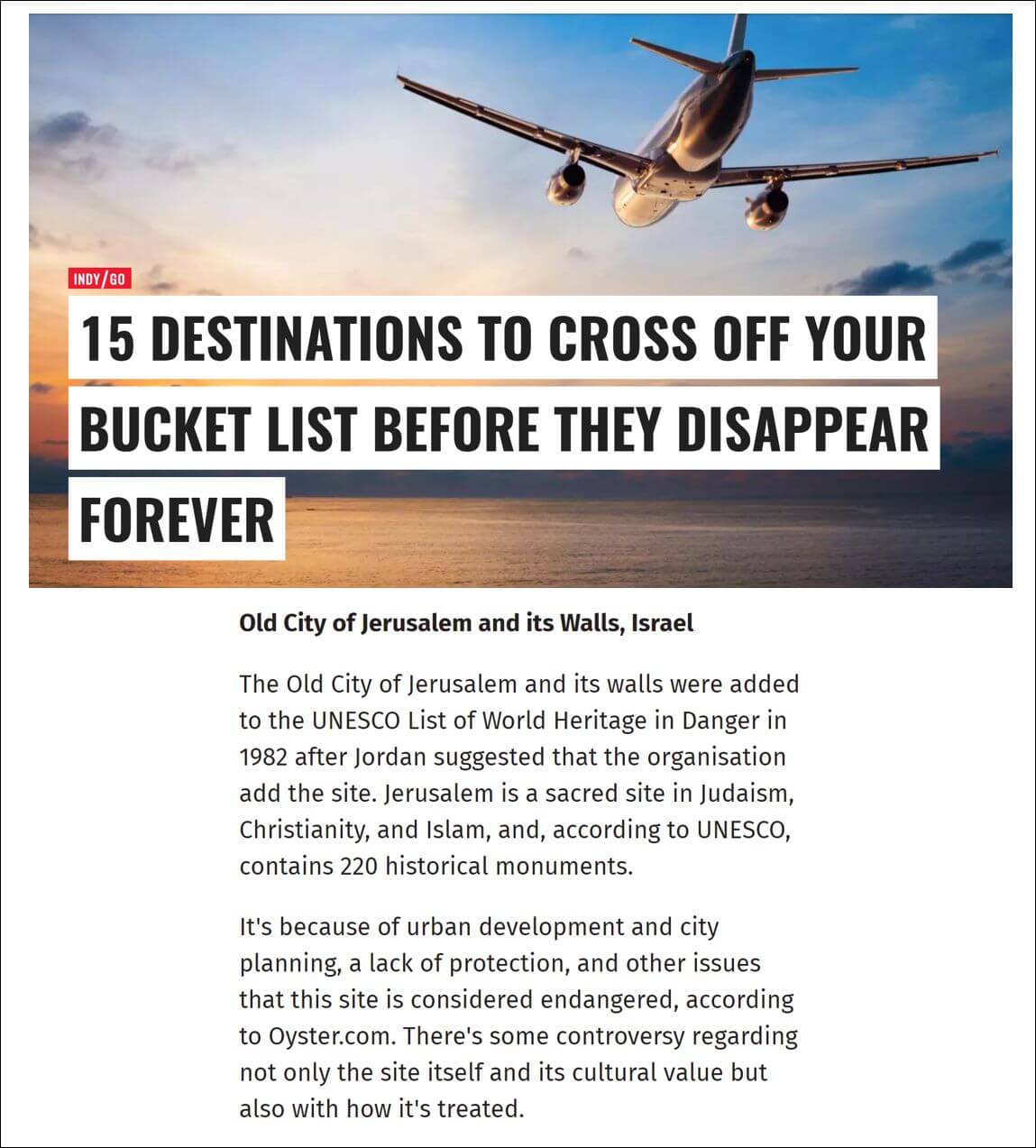 Given that the Old City is probably the most important tourist destination in Israel, we would definitely put it on anyone’s bucket list of places to visit. But the only thing that looks to be disappearing is commonsense on the part of the author of this feature, Business Insider editors for keeping Jerusalem in the article, and The Independent for blindly republishing the piece.