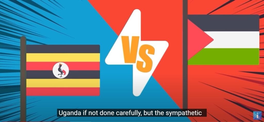But only seconds later (7:13), the narrator discusses the possibility of a crisis between Uganda and Israel. Note the Palestinian flag.