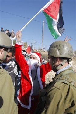 A Palestinian man dressed in a Santa Claus outfit and holding a Palestinian flag protests behind Israeli soldiers during a weekly demonstration against Israel's separation barrier in the West Bank village of Maasarah, near Bethlehem, Friday, Dec. 17, 2010. Israel says the barrier is necessary for security while Palestinians call it a land grab. (AP/Nasser Shiyoukhi)